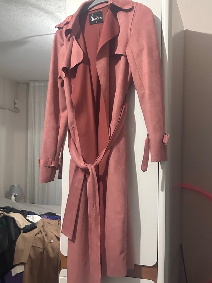 Pembe süet kumaştan, kemerli ve uzun kollu, kesimi vücuda oturan, yakası kesimli uzun kadın trençkotu. Hiç giyilmedi
