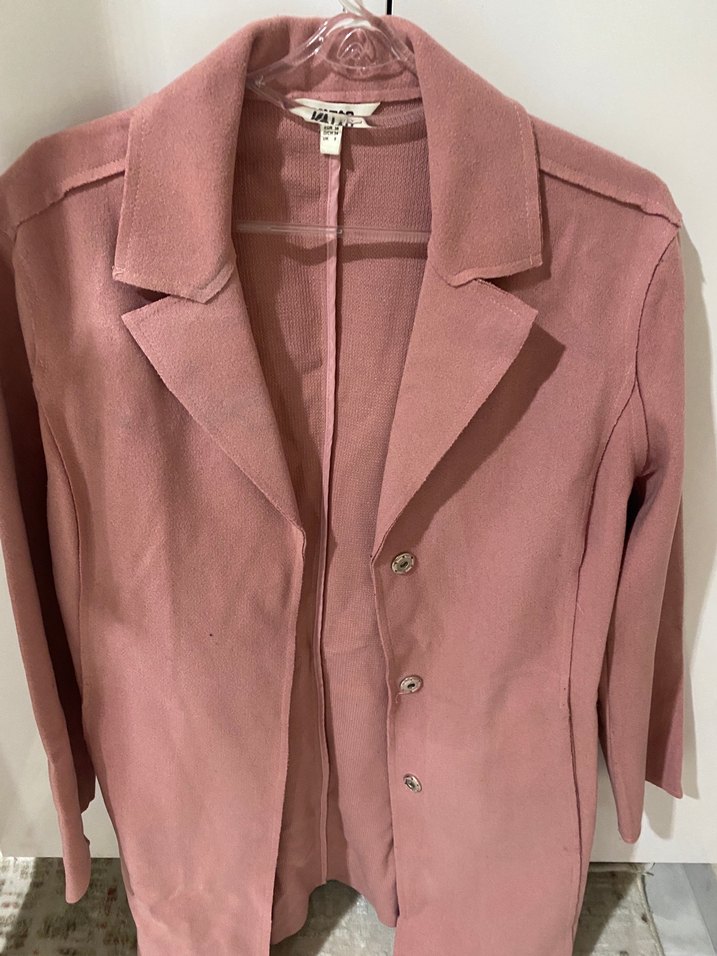 Pembe süet kadın kaban, kesik yaka ve düğmeli kapama özelliğine sahiptir. Normal kesim, uzun kollu ve midi boydadır, ofis için uygundur. Desensiz, trend günlük stil sunar.