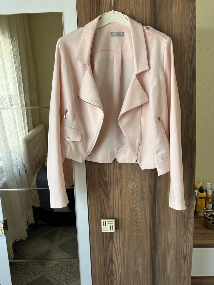 Pastel pembe renkte süet mini kadın ceket, kesik yaka ve uzun kolludur. Düğmeli detaylara sahip, rahat kesim ve desen içermeyen Paris tarzı bir ceket.