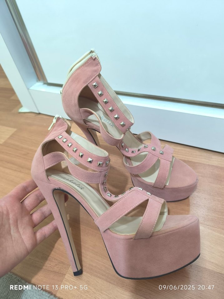 Pembe pastel süet malzemeden yapılmış, tokalı ve platform topuklu kadın abiye ayakkabılar, gösterişli parti kombinleri için uygundur. ✨
