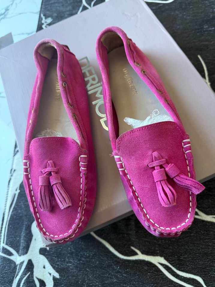 Pembe süet malzemeden yapılmış, püsküllü ve pastel tonlarda kız loafer ayakkabı. Sokak stiline uygun, desensiz ve beyaz dikiş detaylı.