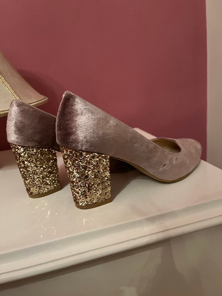 Pembe süet üst ve sim kaplı kalın topuklu kadın ayakkabılar, romantik akşamlar için klasik ve modern bir şıklık sunar.