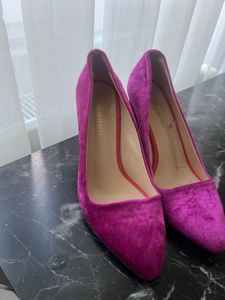 Pembe süet stiletto topuklu, parlak görünümlü ve tokalı, modern klasik Paris tarzı ile romantik buluşmalar için uygun.