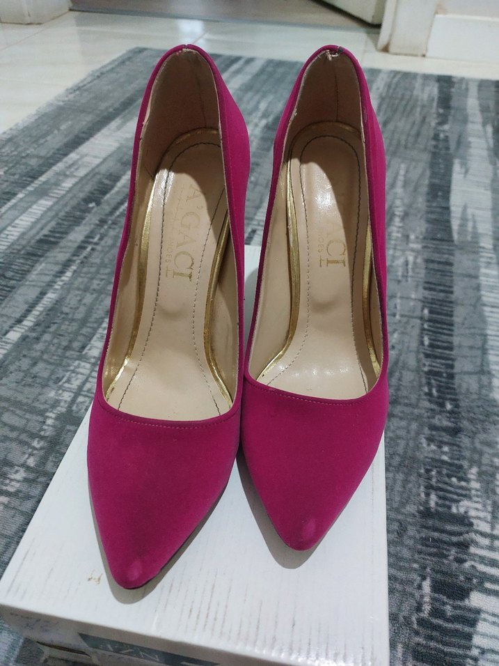 Pembe süet malzemeden yapılmış, parlak görünümlü, tokalı kadın stiletto ayakkabılar. Modern klasik stili ve sivri burunlu tasarımıyla romantik akşamlar için ideal. 38 numara -