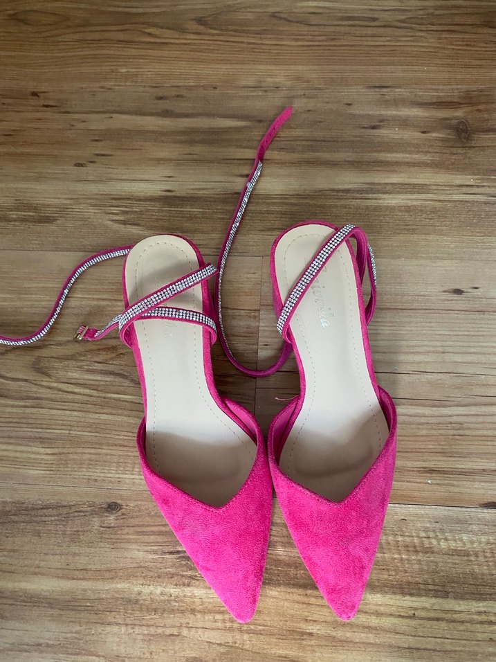 Pembe süet malzemeden yapılmış, stiletto topuklu kadın ayakkabısı. Kurdele detayıyla minimalist ve bohem tarzı yansıtır, parti için uygundur. Canlı ve desensiz tasarım.