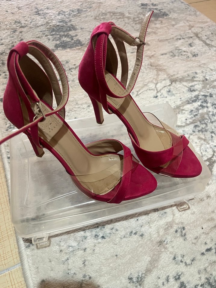 Pembe süet ince topuklu ayakkabılar, tokalı bant ve parlak desenli detaylarla romantik akşamlar için modern klasik tarz sunar.