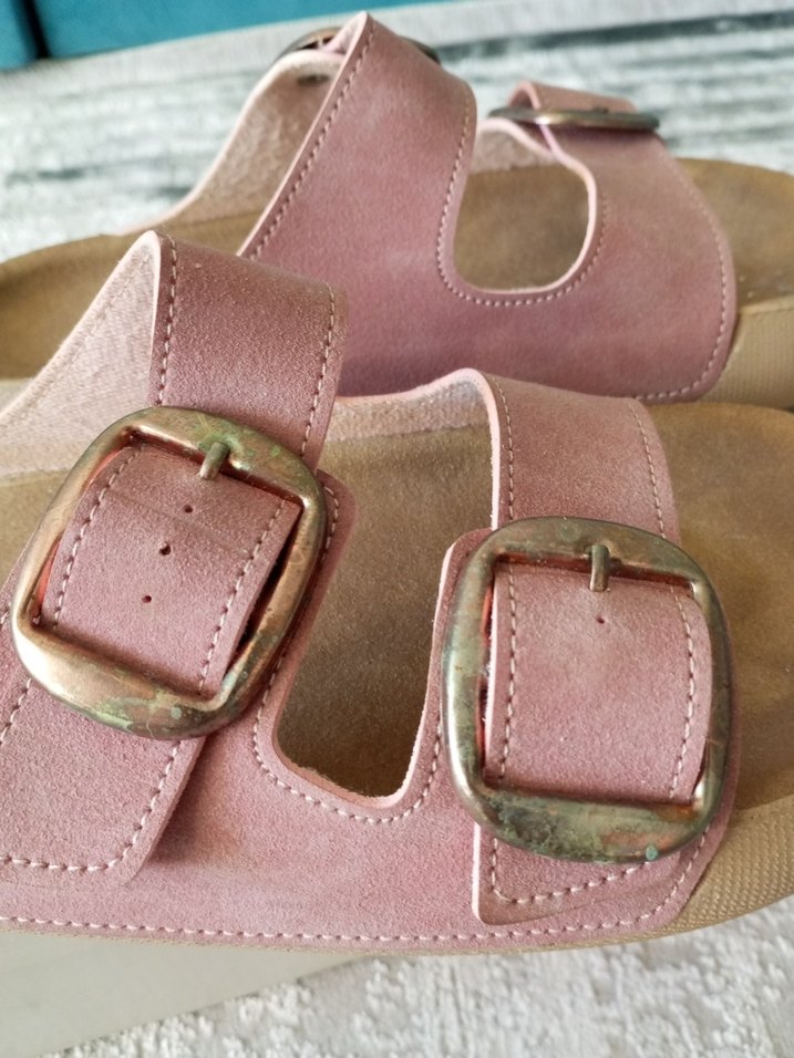 Pembe süet malzemeden, tokalı bantlara ve kama topuğa sahip kadın terlik. Yumuşak pastel tonlarda, vintage bohem tarzı ile günlük kullanıma uygun.