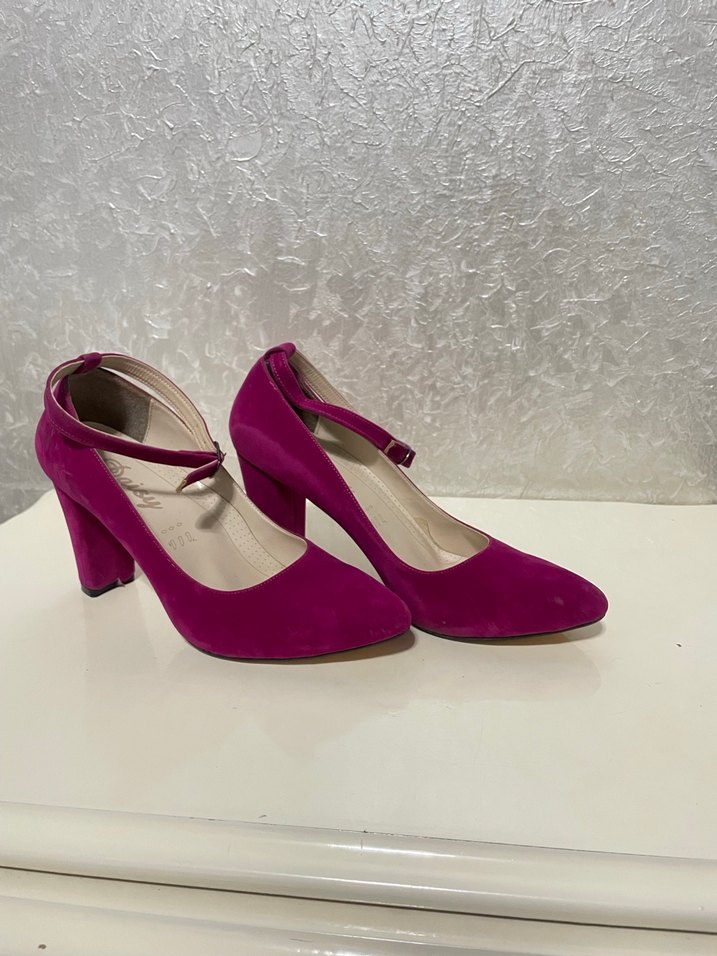 Pembe süet malzemeden yapılmış, tokalı modern klasik stilettolar. Renkli ve romantik akşamlar için ideal.