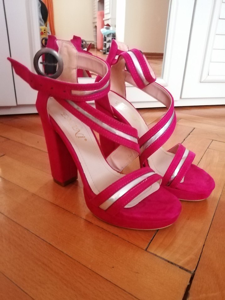 Pembe süet malzemeden, tokalı yüksek topuklu ve parlak çizgili bantlara sahip bu ayakkabılar, romantik akşamlar için çağdaş ve cesur Paris tarzını yansıtıyor Topuk boyu 10/12 cm arası . hiç giyilemedi süet