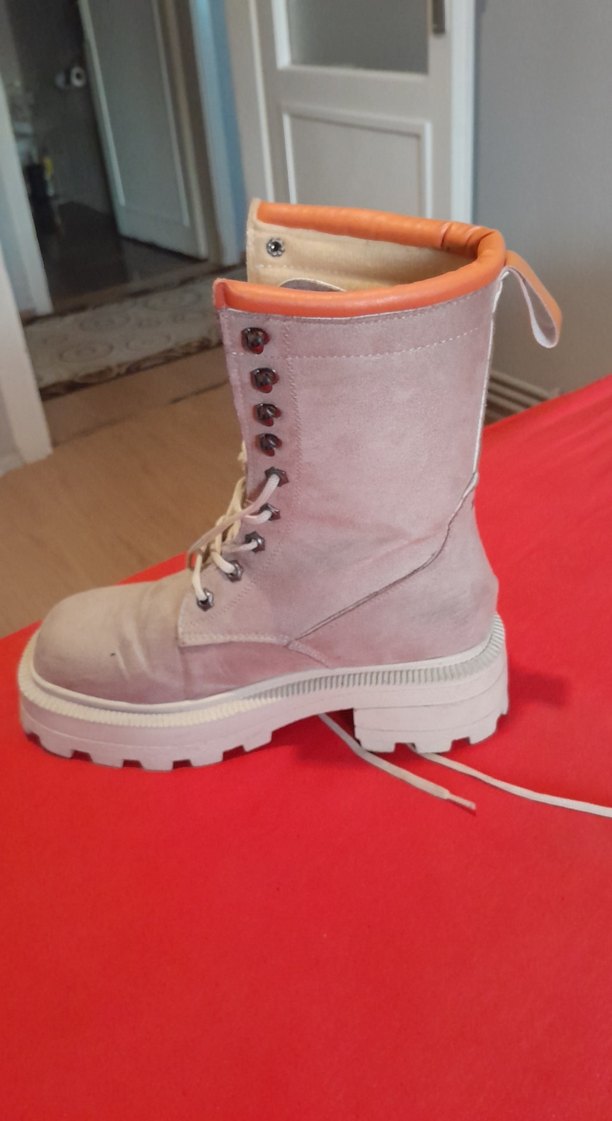 Pembe ve gri tonlarında süet malzemeden, yüksek topuklu ve bağcıklı kadın bot. Sokak stili ve günlük kullanım için uygundur.