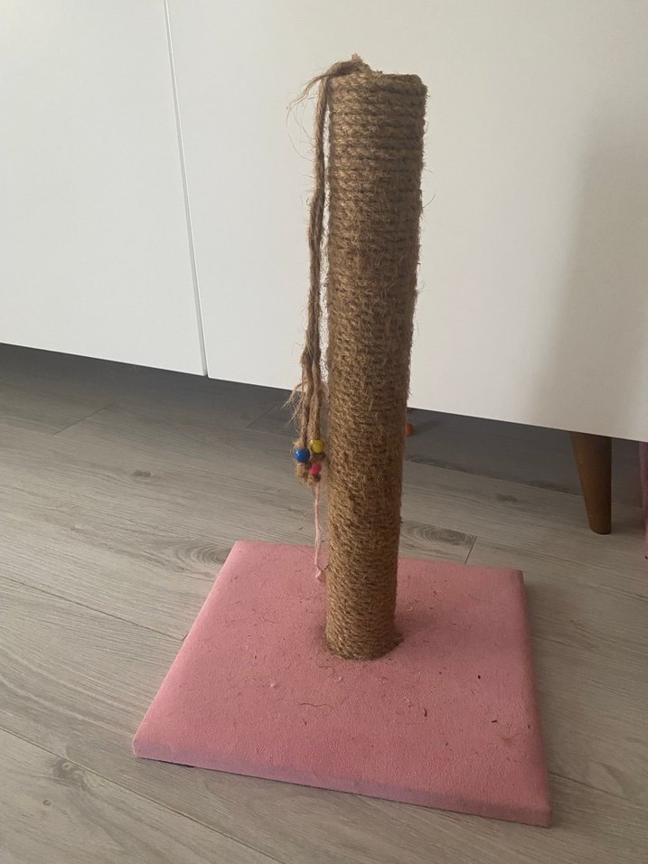 Pembe tabanlı, sisal kaplı uzun bir direği ve renkli boncuklu asılı ipi olan kedi tırmalama tahtası.