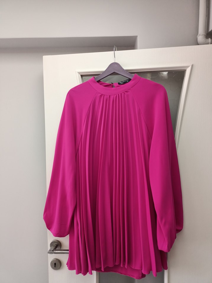 Pembe parlak renkte, uzun kollu, yüksek yakalı şifon takım .Rahat kesimi ve boy uzunluğuyla akşam davetleri için uygundur.