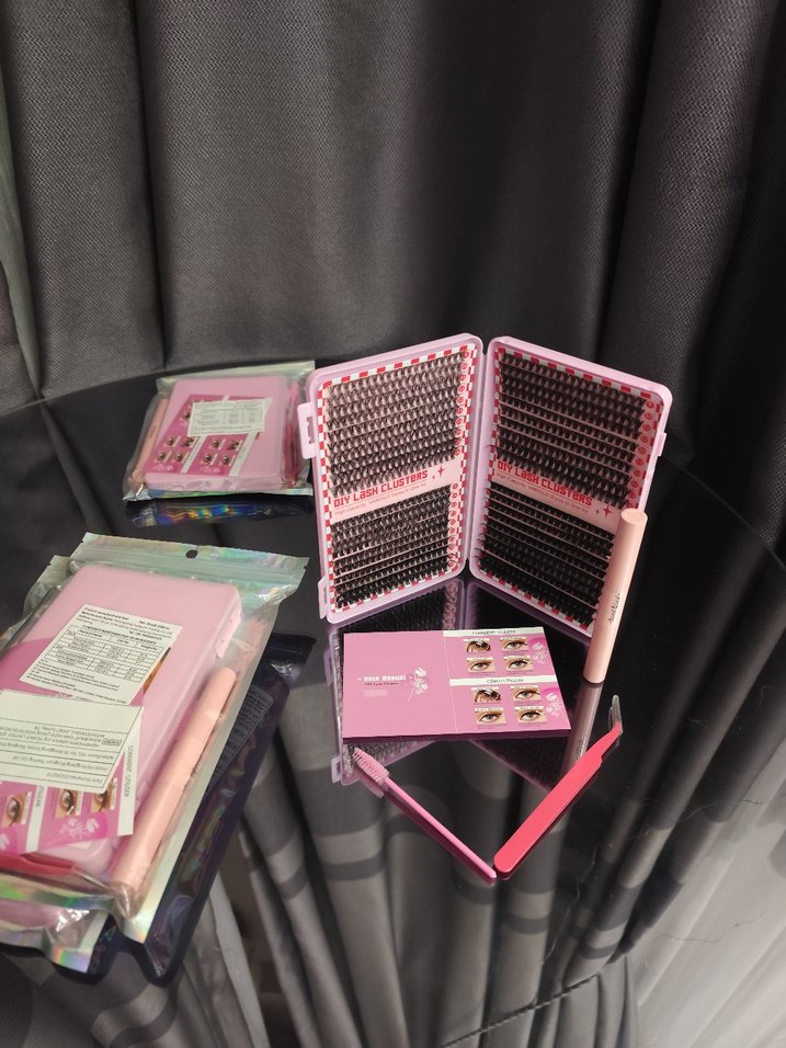 Çoklu kirpik kümeleri ve uygulama aparatı içeren açık pembe takma kirpik seti. Kullanımı kolay, talimat kılavuzu dahil. ️