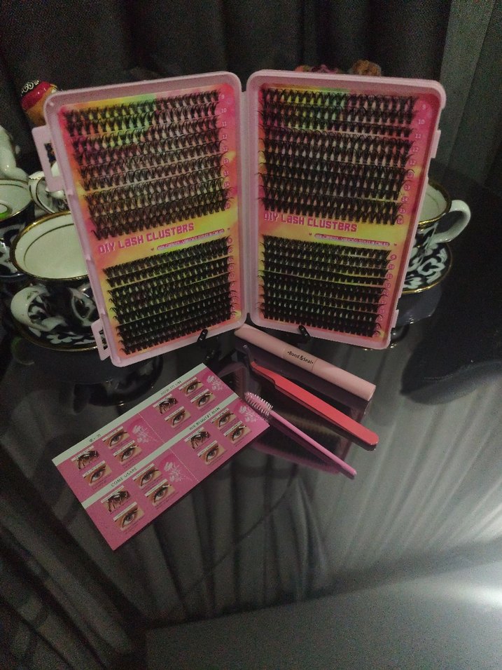 Pembe kutuda koyu renk takma kirpikler, pembe aplikatörler ve yapışkan şeritler içeren set. Göz görünümünü artırmak için uygun. ️