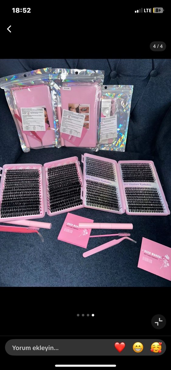 Açık pembe renkli takma kirpik seti, çeşitli kirpik tepsileri ve uygulama araçları içerir. Kolay kullanım için cımbız ve kirpik yapıştırıcısı dahildir.