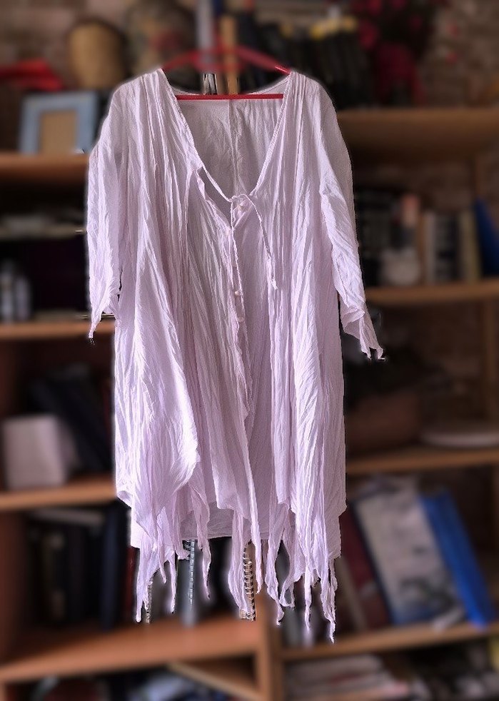 pembe tülbent kumaştan, uzun kollu. önünde mini düğmeleri var. iki katlı, üst katman parçalı kesim. bohem tarzda uzun tunik. xxl beden (en 58 boy 80-90 cm). yeni gibi, kusursuz.