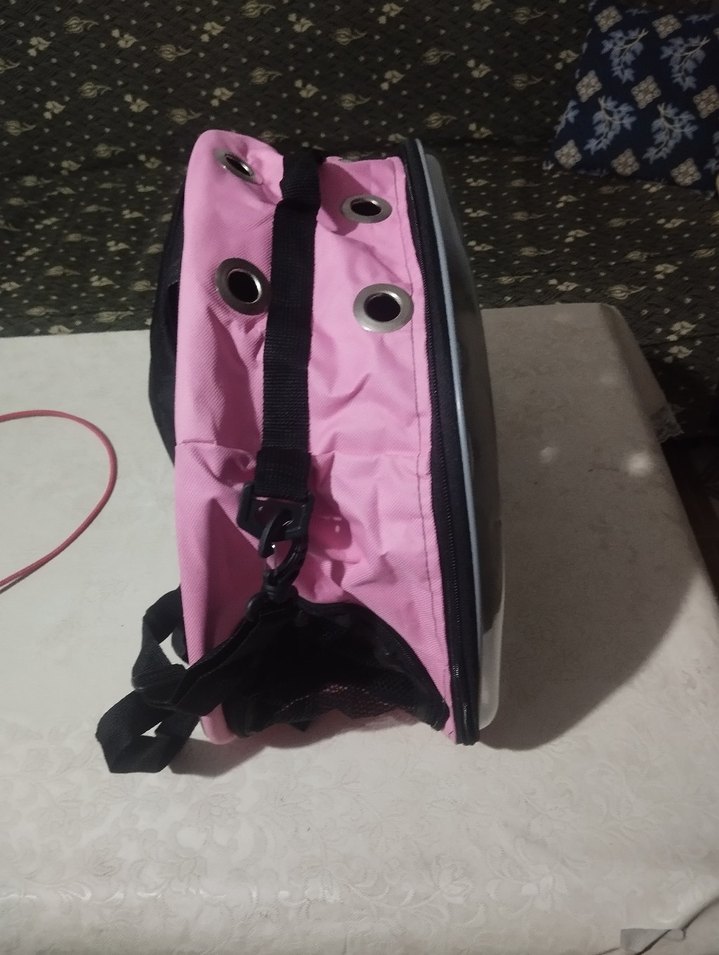 Koyu pembe renkte, havalandırma delikleri ve ayarlanabilir askısı olan taşıma çantası Evcil hayvanlar için uygundur.Hem yandan askısı var hem sırt askısı var her türlü taşımaya kedim hiç kullanmadı
