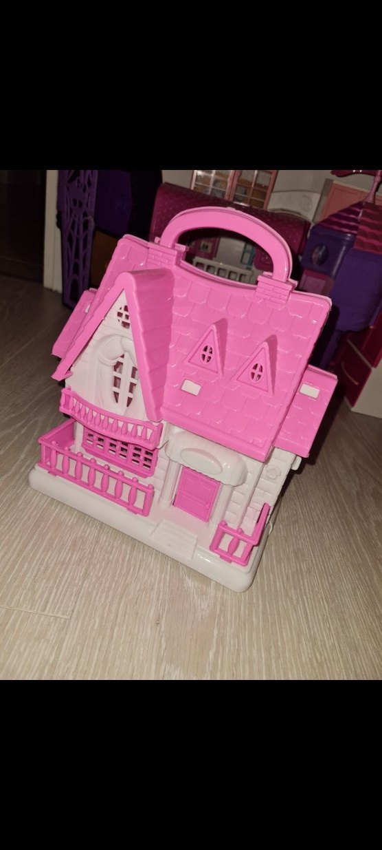 Pastel pembe renkte, taşıma kulplu oyuncak ev. Detaylı pencere ve kapılarıyla hayal gücünü destekler.