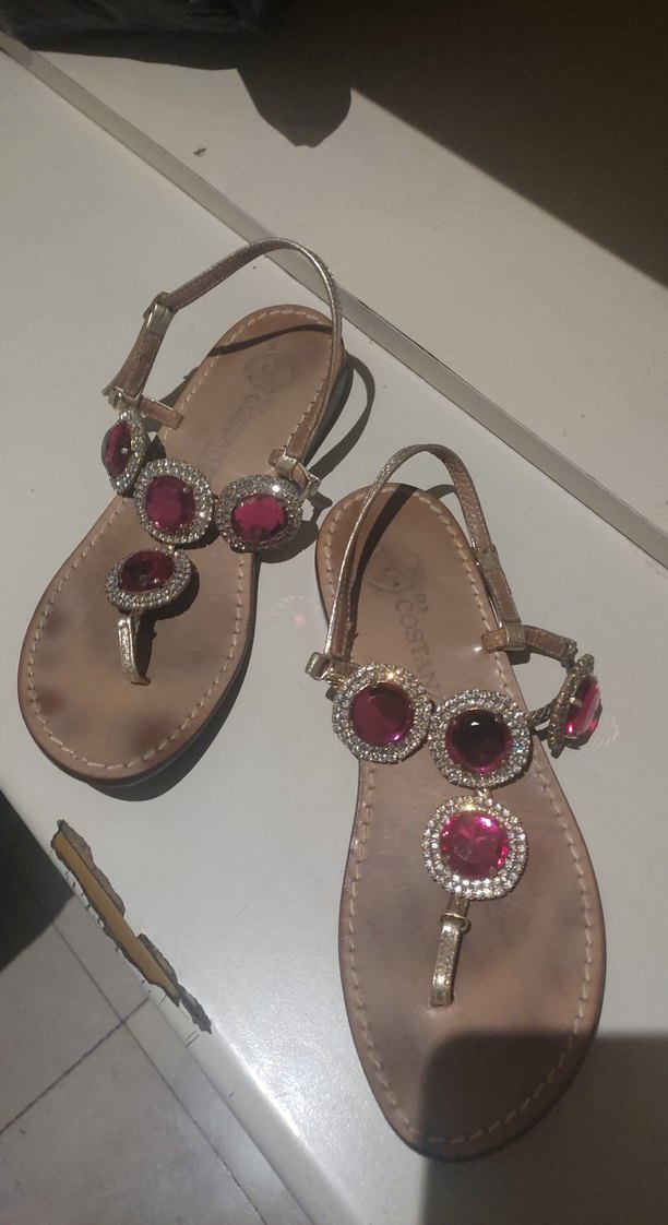 Pembe deri, parlak yılan desenli ve tokalı sandaletler, büyük pembe taş detaylı. Dolgu topuklu, romantik akşamlar için uygun.