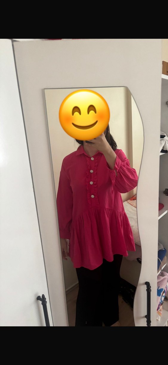 Parlak pembe renkte, düğmeli, uzun kollu, taş detaylı yakalı ve bol kesim tunik. Yumuşak keten kumaştan, günlük kullanıma uygun bağlama deseniyle. S-M bedendir
