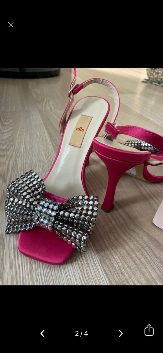 Pembe, taşlı fiyonk detaylı yüksek topuklu ayakkabılar. Sentetik kumaştan, parlak ve çağdaş tasarımda, romantik geceler için uygun.