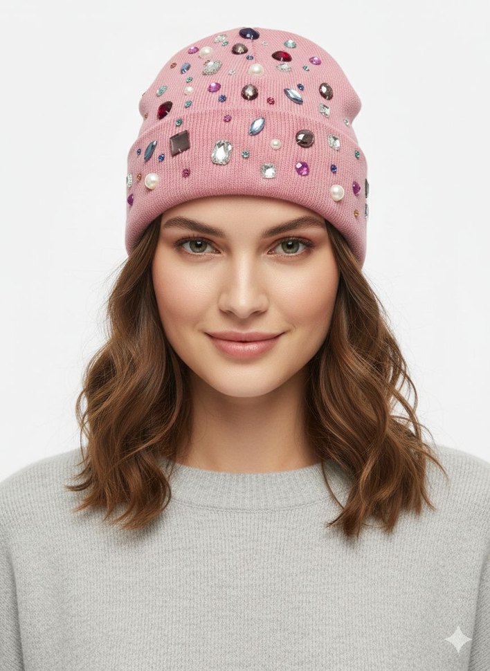 Pembe renkli, payet ve inci detaylı örme kadın bere, rahat ve trend bir görünüm sunar. Pastel tonlarıyla pop kültüründen esinlenmiştir.