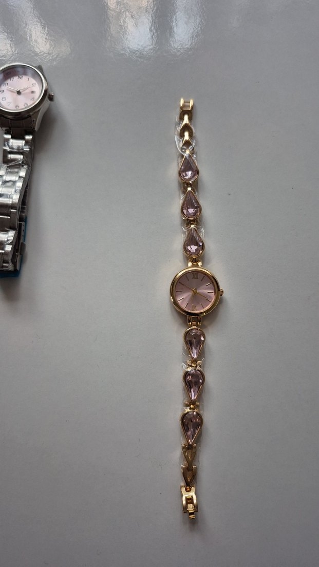 Pembe taşlarla süslenmiş altın tonlu zincir ve açık pembe kadranıyla klasik ve çağdaş tarzı bir araya getiren kadın kol saati. ✨