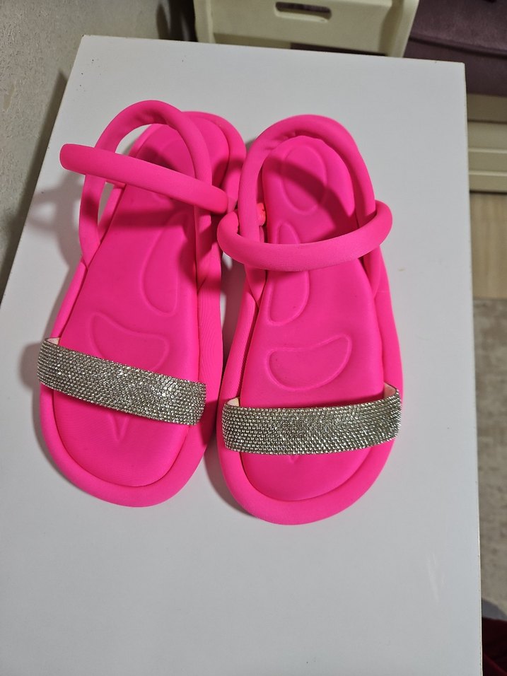 Pembe renkte, taşlı bant detaylı kadın sandalet. Kauçuk malzemeden üretilmiş, sokak modası ve günlük kullanım için uygundur.