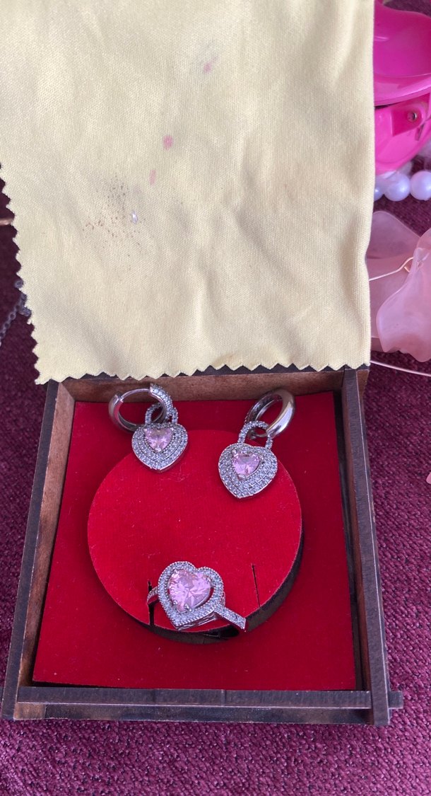Kadın takı seti, parıltılı pembe kalp taşları ve işlemeli payetlerle romantik geceye uygun, göz alıcı ve bohem tarzda tasarlanmıştır.