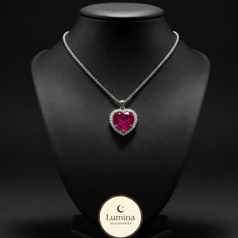 Renkli pembe kalp şeklinde, payet detaylı kısa kolye. Romantik geceler için uygun. Marka: Lumina.
