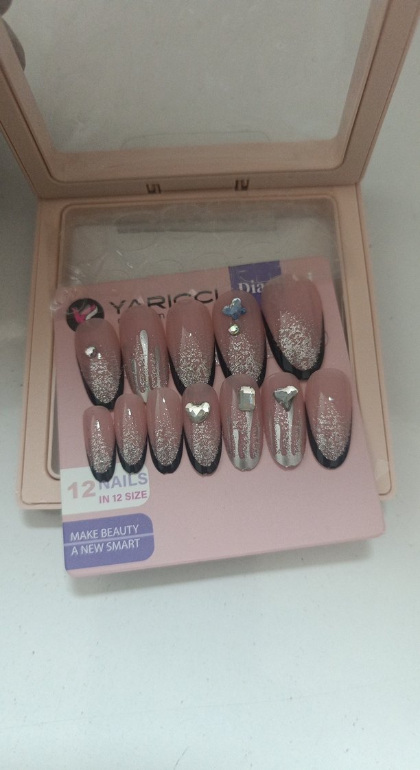 12 farklı boyda, koyu uçlu ve parlak gümüş simli pembe takma tırnak seti. Üzerinde çeşitli küçük taş süslemeleri bulunur.