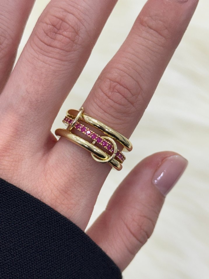 Parlak pembe tokalı detaylı kadın yüzük, romantik akşamlar için çağdaş Paris tarzını yansıtır. Avant-garde ve trend belirleyici bir tasarım.