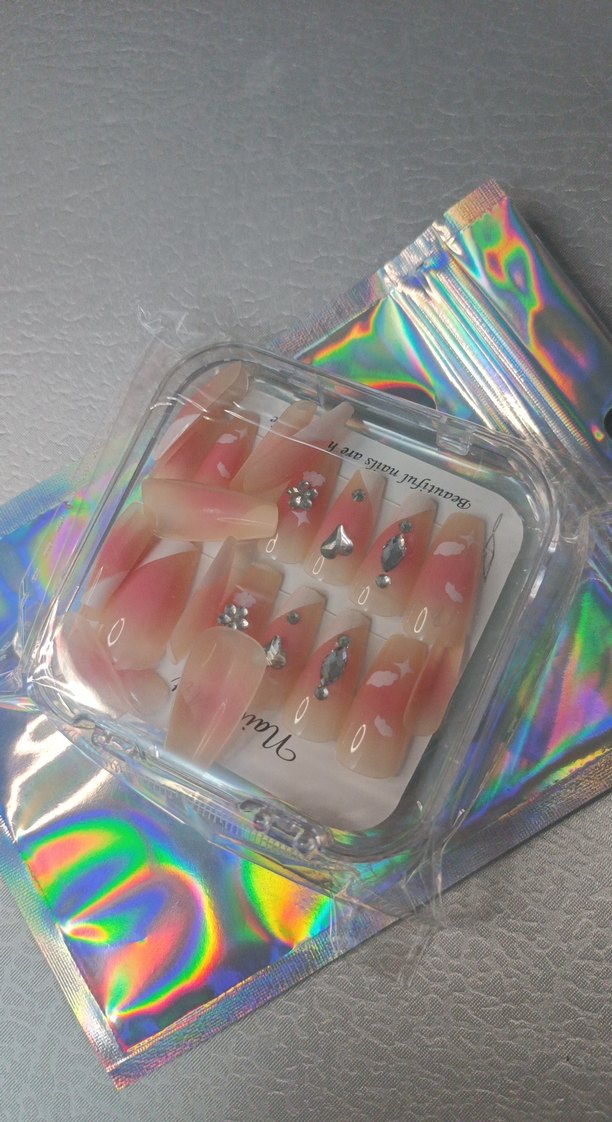 Parlak taş detaylı, çeşitli şekillerde açık pembe tırnak süslemeleri. el ve ayak tırnakları dahil tüm set stick yapıştırıcı ve törpü de var içerisinde