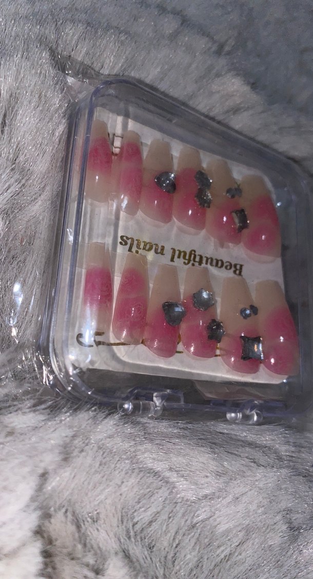 Açık pembe tonlarında, siyah taşlarla süslenmiş yanlış tırnaklar, şeffaf plastik kutuda sunulmuştur.