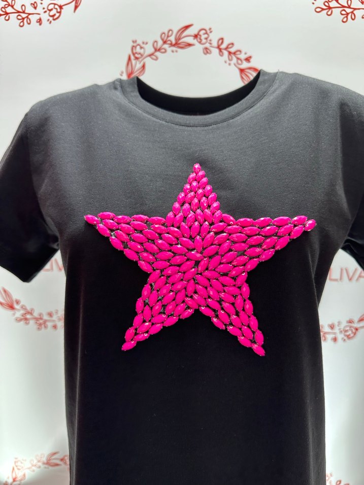 Siyah kısa kollu tişörtün önünde büyük pembe taşlı yıldız deseni bulunmaktadır Yuvarlak yaka ve normal kesim, yumuşak pamuk kumaştan yapılmıştır. ⭐S-M-L bendenleri ve pembe, mavi, siyah, beyaz renkleri mevcuttur ✨✨