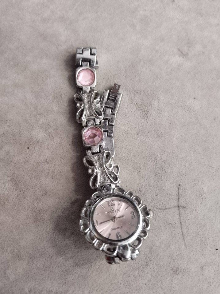 Gri zincir detaylı, pembe taşlı vintage tarzda kadın saati. Bohem stil ve quartz mekanizmaya sahip yuvarlak kadranlı.