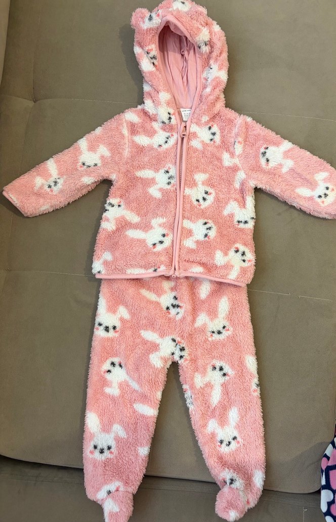 Pembe tonlarında, tavşan desenli, kapüşonlu ve uzun kollu kürk detaylı bebek kız takımı.