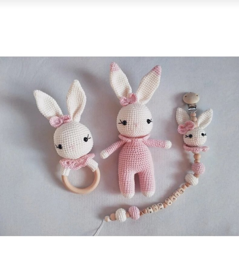 Pastel pembe renkli, tığ işi tavşan figürlü diş kaşıyıcı, yumuşak oyuncak ve boncuklu emzik klipsi seti.