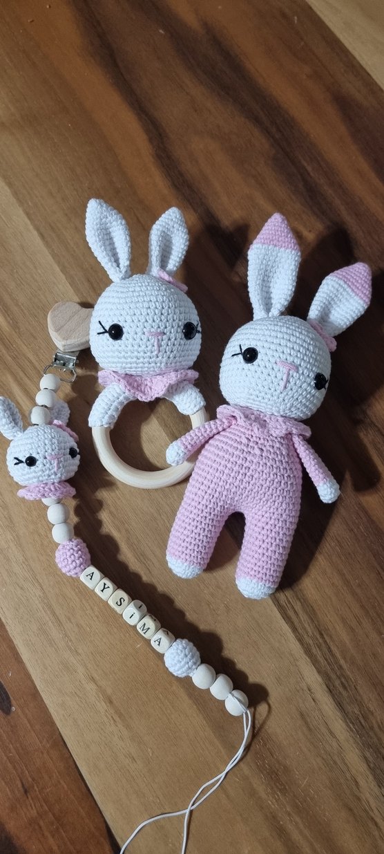 Pastel pembe örme tavşan diş kaşıyıcı ve çıngırak seti, yumuşak dokulu ve kişiselleştirilmiş isimli klips içerir. Bebekler için güvenlidir. 22 cm