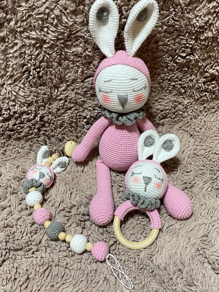 Pastel pembe renkli, yumuşak örme tavşan figürlü diş kaşıyıcı ve emzik zinciri seti, bebekler için nazik rahatlama sağlar. Sipariş verdikten sonra 1 hafta içinde gönderilir