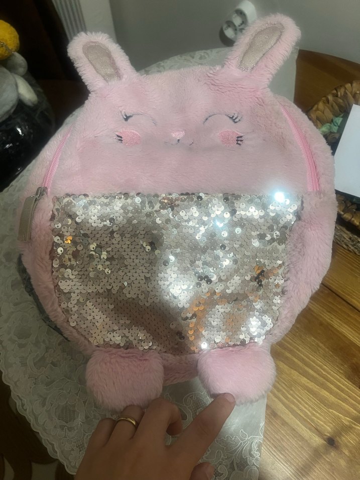 Yumuşak pembe kumaştan yapılmış, kulaklı ve önü payetli cepli tavşan figürlü çocuk okul çantası. Eğlenceli ve sevimli tasarım.