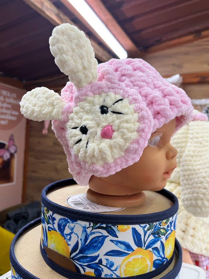 Yumuşak ve pastel pembe renkte, kulakları ve yüz detayları olan tavşan figürlü kulaklık