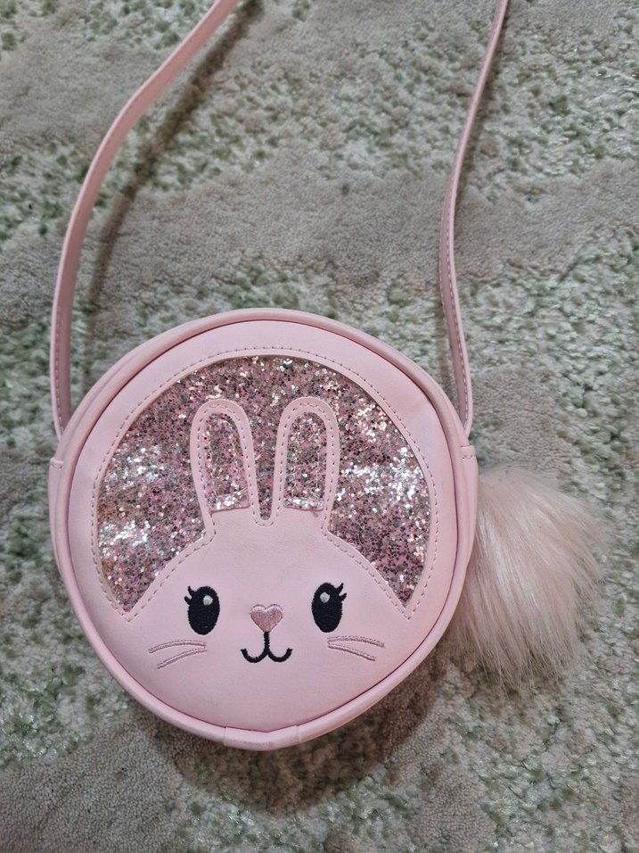 Pastel pembe yuvarlak çanta, simli baskılı tavşan yüzü ve yumuşak peluş ponpon detayına sahiptir. Bohem ve retro tarzda, rock punk havası taşıyor.