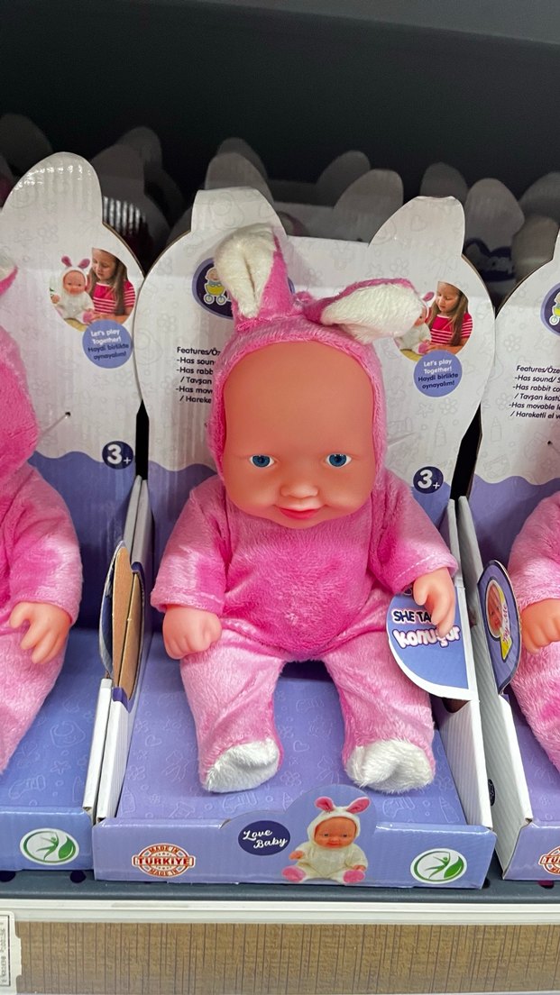 Pastel pembe, yumuşak tavşan kostümü giymiş, 3 yaş ve üzeri çocuklar için uygun bebek.