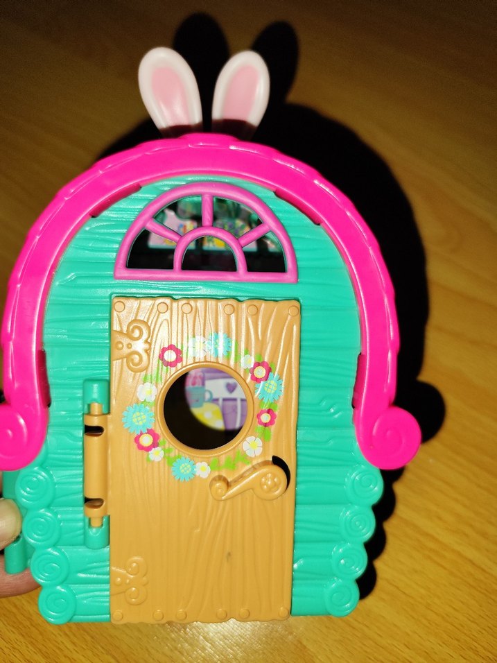 Pembe çerçeveli, tavşan kulaklı ve çiçekli detaylı ahşap görünümlü kapaklı renkli oyuncak kapı.