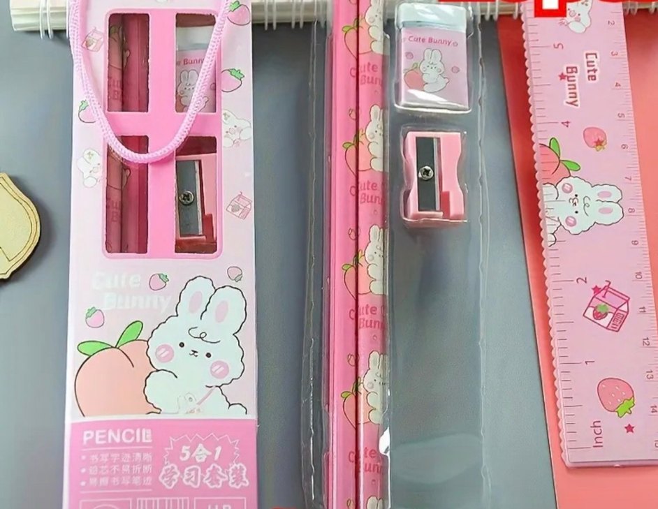 Pembe renkte, pastel tonlarda tavşan figürlü kalemler, silgi ve kalemtıraş içeren kırtasiye seti. 1 kutu fiyatı