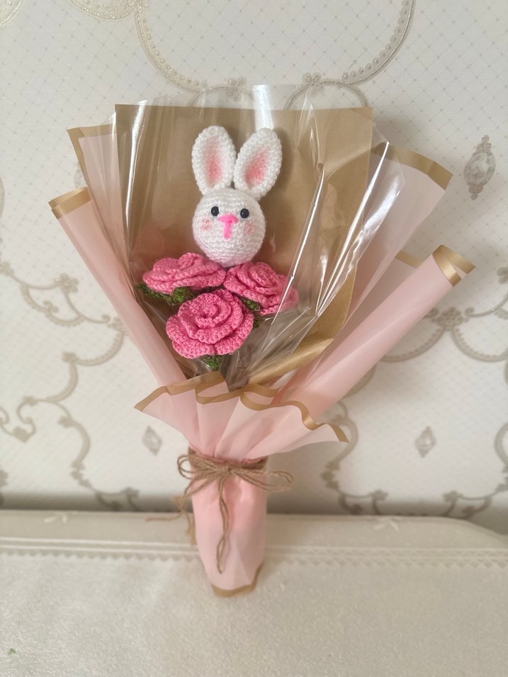 Pastel pembe renkte, tavşan başlı ve üç pembe gülden oluşan peluş oyuncak buketi, yumuşak pembe kağıda sarılı ve ip ile bağlanmış.