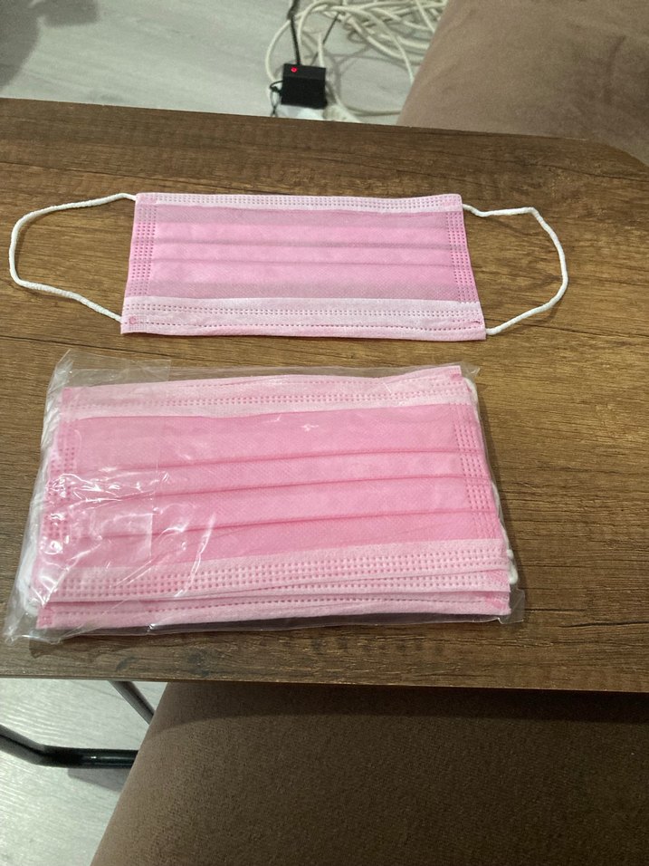 Kulak bantlı pembe tek kullanımlık yüz maskeleri. Yumuşak ve nefes alabilir malzemeden üretilmiştir. Pakette birden fazla maske bulunur.