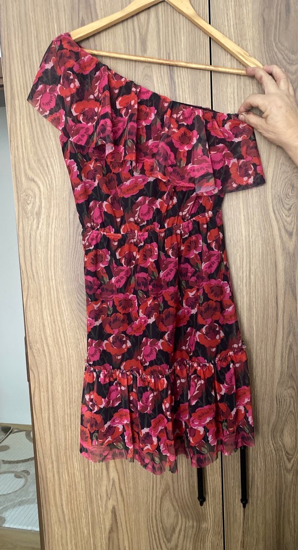 Pembe tonlarda koyu renkli tie-dye desenli, straplez yaka ve fırfır detaylı, bol kesim midi boy sentetik kumaş elbise. Romantik gece için uygun bohem tarz.