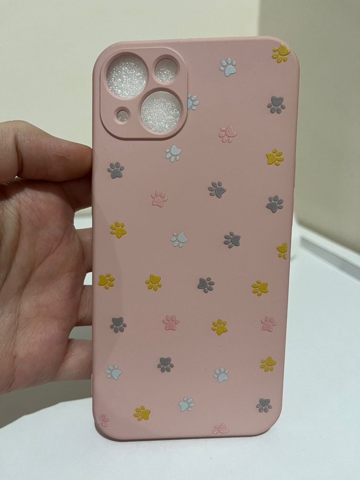 Pastel pembe renkte, küçük pullu pati desenleriyle bohem tarzda telefon kılıfı. Hem şık hem koruyucu iPhone 13-14 uyumlu sorunsuz temiz .